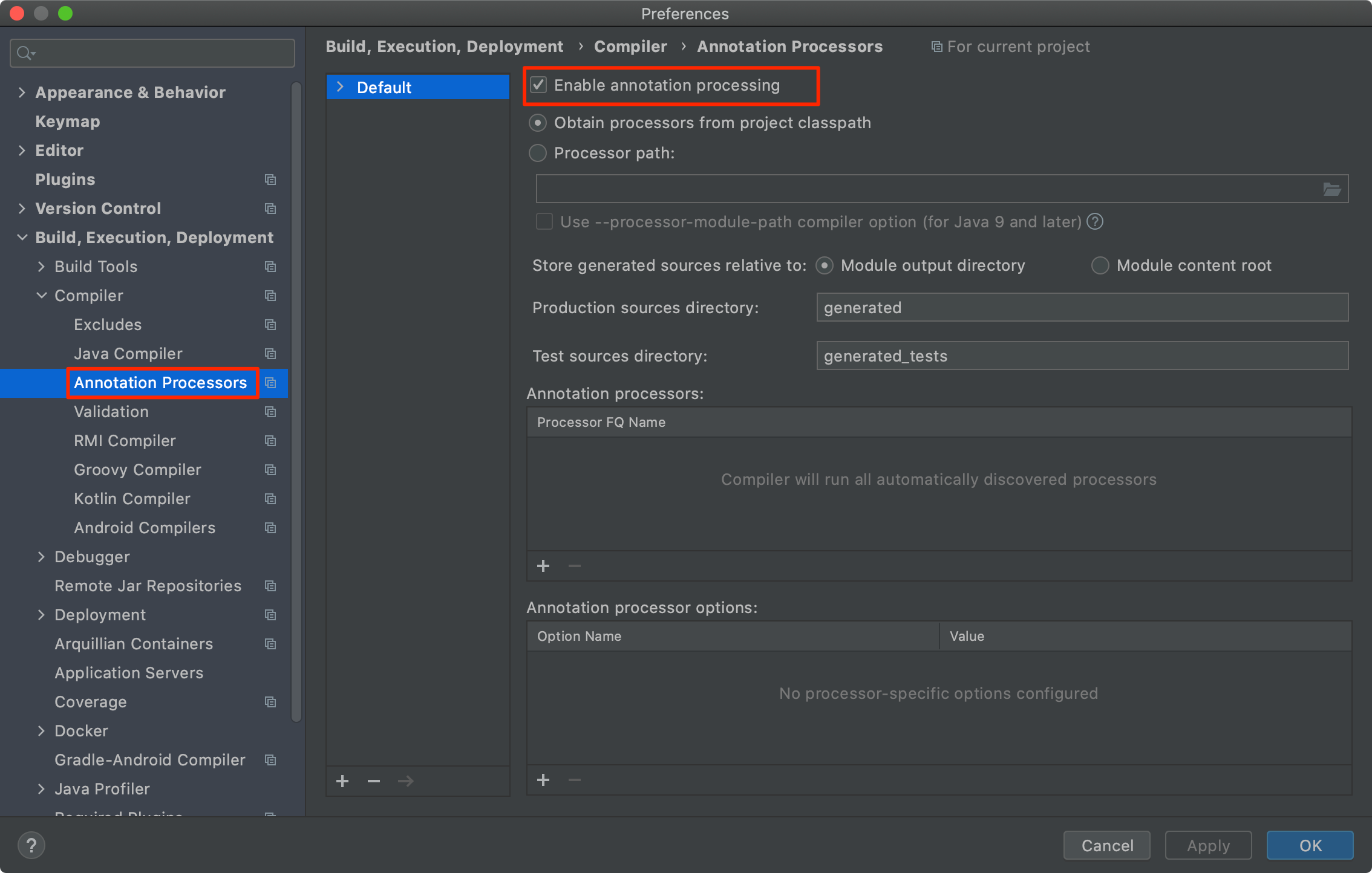 1-2. Setting > Build, Execution, Deployment > Compiler > Annotation Processors > Enable annotation processing 체크