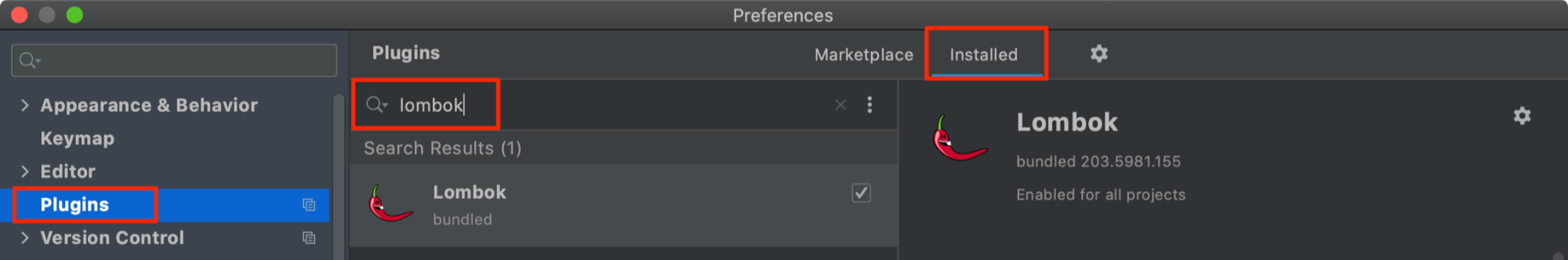 1-1. Setting > Plugins > Lombok Plugin install 확인