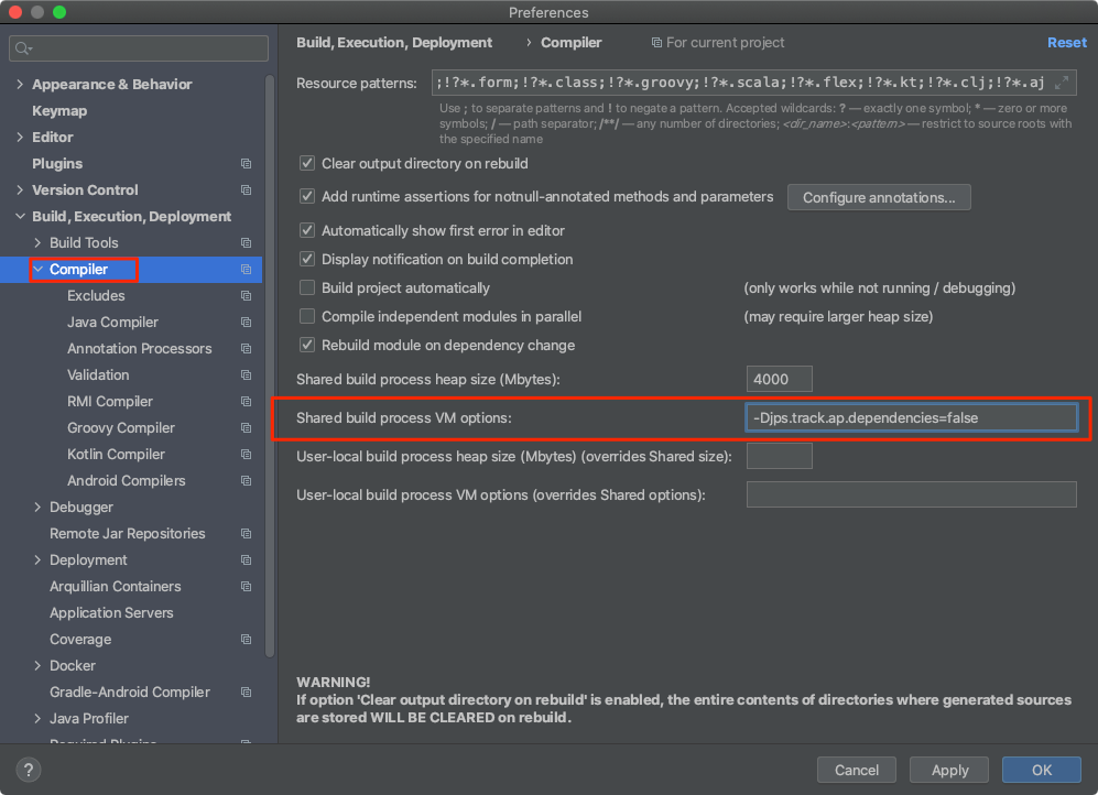 3. 위 방법으로도 해결되지 않았다면 JPS annotation processing 을 비활성화 하여 MapStruct processor의 기존 빌드로 컴파일 할 수 있도록 컴파일러의 Build process VM option을 추가해 주세요. jetbrains 이슈 노트를 보니 mapping processor 내에서 NPE(java.lang.NullPointerException)가 발생하여 컴파일러가 종속성 정보를 수집하지 못해 발생하는 문제로 보이는데 자세한 내용은 하단 reference를 참고 바랍니다.