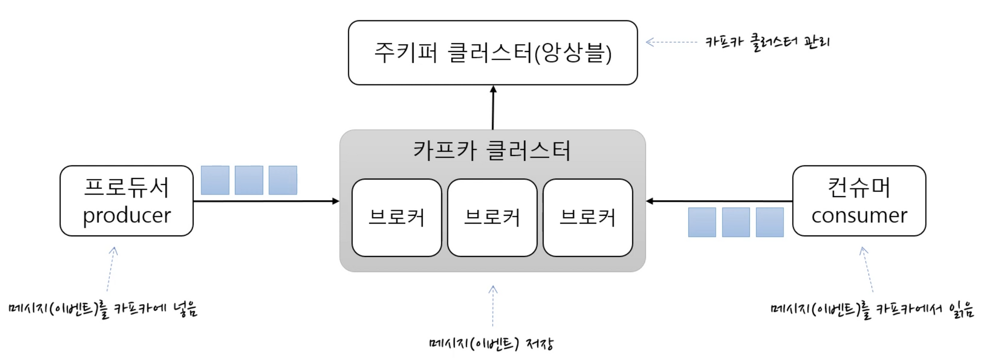 - 메시지 필터, 메시지 재전송과 같은 일은 프로듀서, 컨슈머에 위임