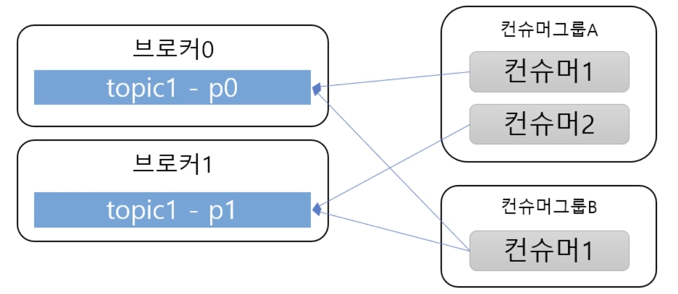- Topic의 파티션은 컨슈머그룹과 1:N 매칭 관계로 동일 그룹내 한 개의 컨슈머만 연결가능 하다.