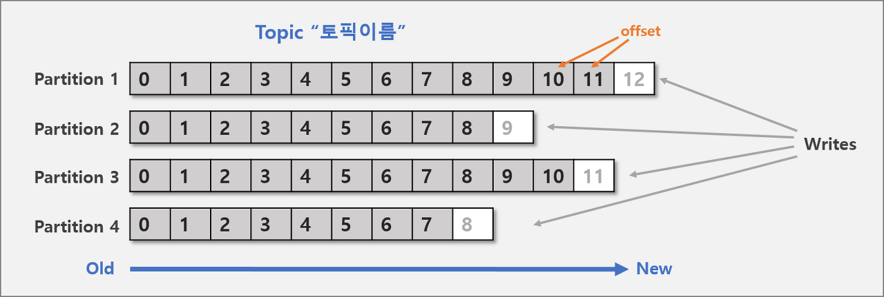 offset: 파티션내 각 메시지의 저장된 상대적 위치- 프로듀서가 넣은 메시지는 파티션의 맨 뒤에 추가 (Queue)
