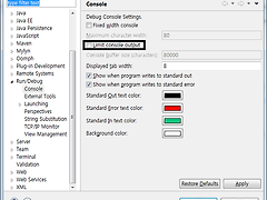 [Eclipse] 이클립스 콘솔 라인 늘리기 ( Release Console Buffer Size ) ※ 이클립스 콘솔 라인 늘리기 ( Release Console Buffer Size ) - Window > Preferences > Run/Debug > Console 아래 두가지 방법으로 조절이 가능합니다. 1. Limit console output의 체크 해제 - 제한 없음2. Console buffer size (characters) 적절한 수치로 조정 IT/Eclipse 2017. 8. 3. 18:26